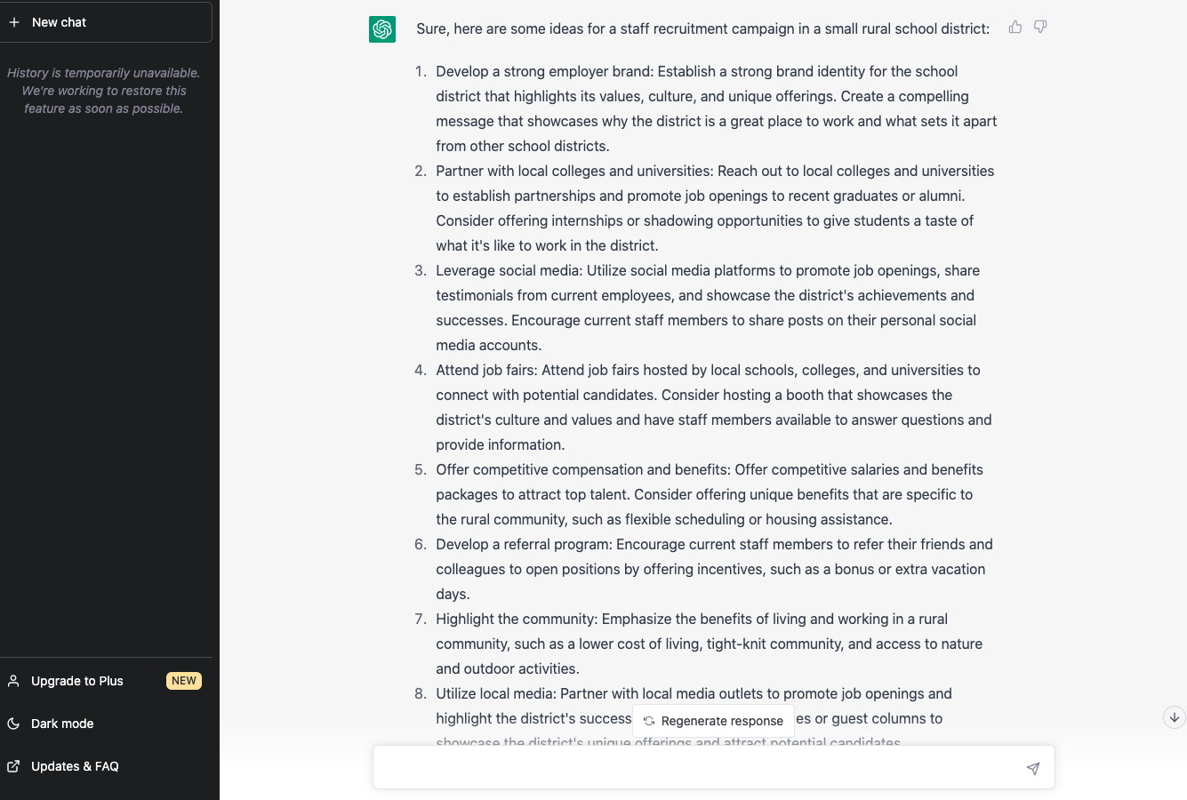 To share how this could work, we typed in, “share ideas for a staff recruitment campaign in a small rural school district” and received the following answer within seconds: